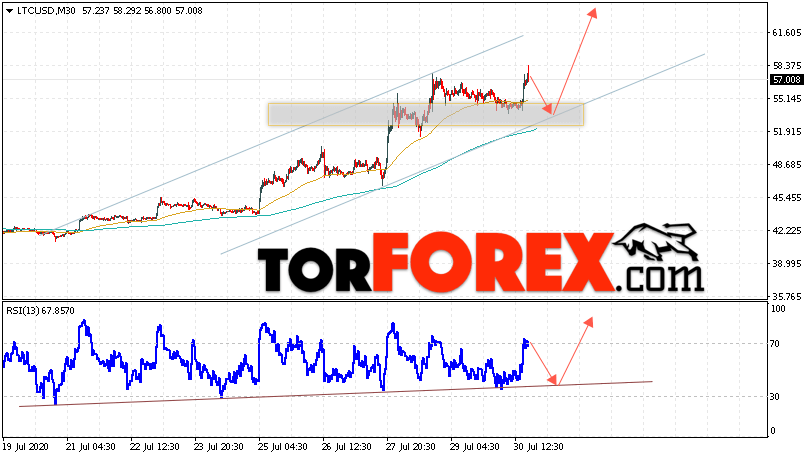 В пользу подъёма котировок LTC/USD выступит тест линии поддержки на индикаторе относительной силы. Вторым сигналом станет отскок от нижней границы восходящего канала. Отменой варианта роста станет падение и пробой области 49.55. Это укажет на пробой области поддержки и ускорение падения курса криптовалюты с потенциальной целью ниже уровня 42.05. С пробоем области сопротивления и закрытием котировок выше уровня 62.05 стоит ожидать подтверждения развития восходящей тенденции по Litecoin.
