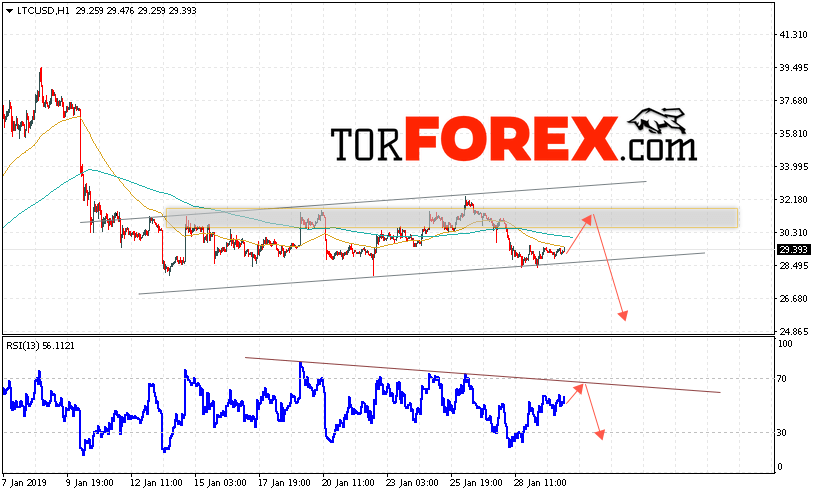 В пользу снижения котировок LTC/USD выступит тест нисходящей линии тренда на индикаторе относительной силы. А также отскок от верхней границы нисходящего канала. Отменой варианта падения станет сильный рост и пробой области 33.55. Это укажет на пробой сопротивления и продолжения роста курса криптовалюты. С пробоем нижней границы канала и закрытием котировок ниже уровня 27.50 стоит ожидать подтверждения развития нисходящей тенденции по Litecoin.