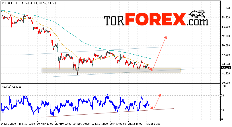 Таким образом, Litecoin прогноз курса криптовалют на 6 декабря 2019 предполагает попытку коррекции и тест области поддержки вблизи уровня 42.05. Откуда стоит ожидать отскок и продолжения роста LTC/USD в область выше уровня 52.85. Дополнительным сигналом в пользу подъёма Litecoin выступит тест линии тренда на индикаторе относительной силы. Отменой варианта роста станет падение и пробой области 37.45. Это укажет на продолжение снижения криптовалюты с целью ниже уровня 25.05.