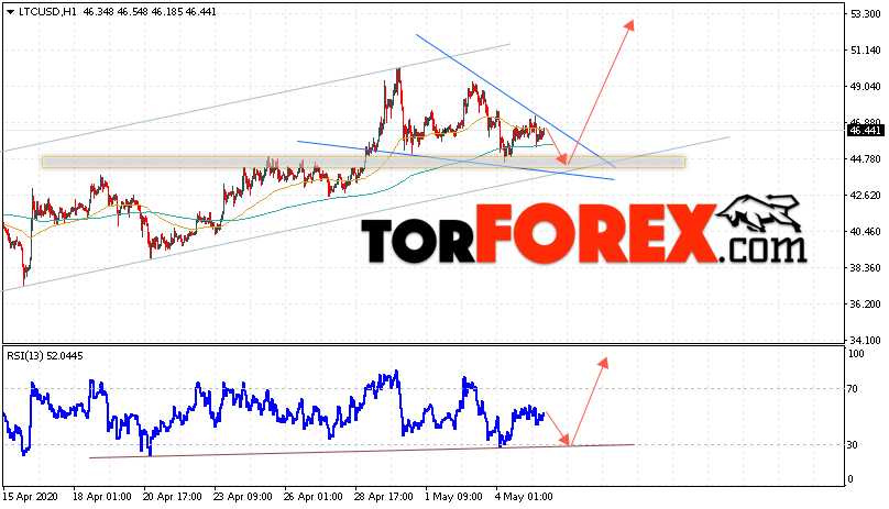 В пользу подъёма котировок LTC/USD выступит тест линии поддержки на индикаторе относительной силы. Вторым сигналом станет отскок от нижней границы восходящего канала. Отменой варианта роста станет падение и пробой области 39.55. Это укажет на пробой области поддержки и ускорение падения курса криптовалюты с потенциальной целью ниже уровня 31.55. С пробоем области сопротивления и закрытием котировок выше уровня 47.05 стоит ожидать подтверждения развития восходящей тенденции по Litecoin.