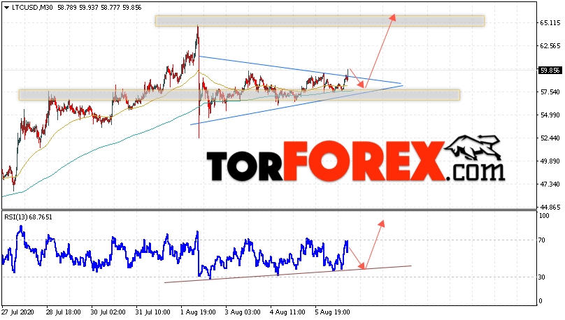 В пользу подъёма котировок LTC/USD выступит тест линии поддержки на индикаторе относительной силы. Вторым сигналом станет отскок от нижней границы модели «Треугольник». Отменой варианта роста станет падение и пробой области 54.55. Это укажет на пробой области поддержки и ускорение падения курса криптовалюты с потенциальной целью ниже уровня 47.65. С пробоем области сопротивления и закрытием котировок выше уровня 60.85 стоит ожидать подтверждения развития восходящей тенденции по Litecoin.