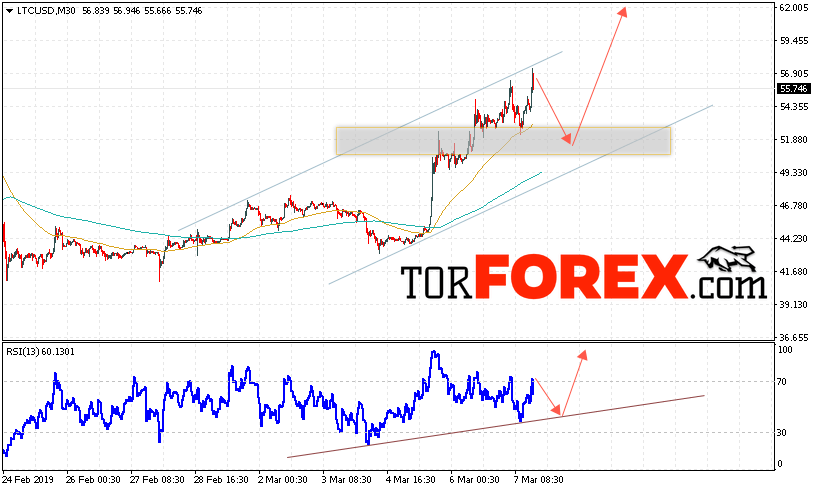 Таким образом, Litecoin прогноз курса криптовалют на 8 марта 2019 предполагает попытку теста области поддержки вблизи уровня 52.00. Откуда стоит ожидать отскок и продолжения роста LTC/USD в область выше уровня 62.25. Дополнительным сигналом в пользу подъёма Litecoin выступит тест линии тренда на индикаторе относительной силы. Отменой варианта роста станет падение и пробой области 48.55. Это укажет на продолжение снижения криптовалюты.