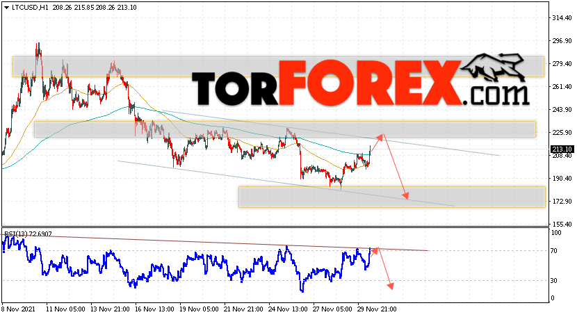 Дополнительным сигналом в пользу падения котировок LTC/USD выступит тест линии тренда на индикаторе относительной силы (RSI). Вторым сигналом станет отскок от верхней границы нисходящего. Отменой варианта падения монеты станет сильный рост стоимости актива и пробой области 245.05. Это укажет на пробой области сопротивления и продолжение подъёма курса криптовалюты с потенциальной целью выше уровня 285.05. С пробоем области поддержки и закрытием котировок ниже уровня 190.55 стоит ожидать подтверждения развития медвежьей тенденции по Litecoin.