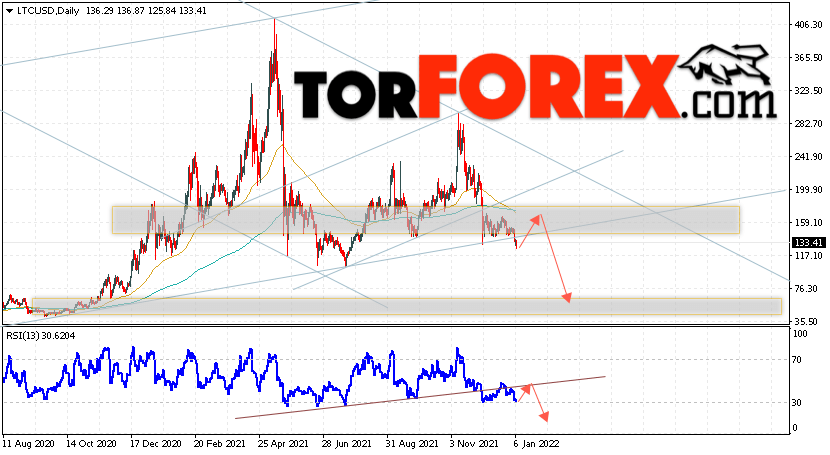 Дополнительным сигналом в пользу падения котировок LTC/USD на текущей торговой неделе 10 — 14 января 2022 выступит тест линии сопротивления на индикаторе относительной силы. Вторым сигналом станет отскок от нижней границы бычьего канала. Отменой варианта снижения цифрового актива Litecoin станет сильный рост цены и пробой области 205.05. Это укажет на пробой сопротивления и продолжение подъёма курса LTC/USD выше уровня 305.05. Подтверждением падению криптовалюты выступит пробой области поддержки и закрытие котировок ниже уровня 105.05.