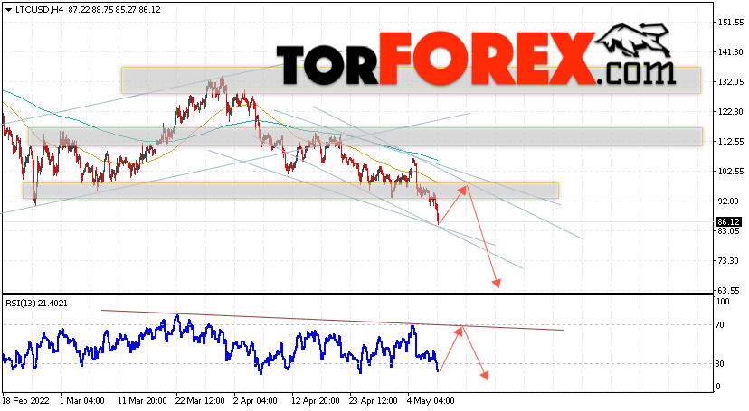 Дополнительным сигналом в пользу снижения котировок LTC/USD выступит тест линии сопротивления на индикаторе относительной силы (RSI). Вторым сигналом станет отскок от верхней границы нисходящего канала. Отменой варианта падения монеты станет сильный рост стоимости актива и пробой области 106.55. Это укажет на пробой области сопротивления и продолжение роста курса криптовалюты с потенциальной целью выше уровня 120.05. С пробоем области поддержки и закрытием котировок ниже уровня 80.55 стоит ожидать подтверждения развития медвежьей тенденции по Litecoin.