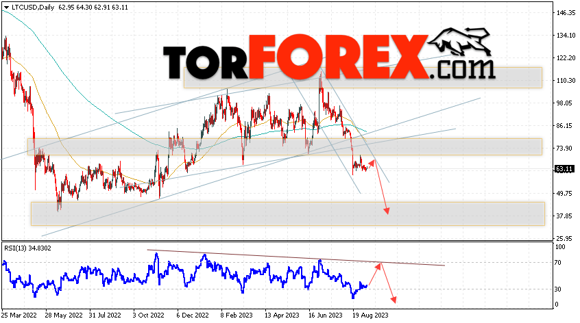 Дополнительным сигналом в пользу падения котировок LTC/USD на текущей торговой неделе 11 — 15 сентября 2023 выступит тест линии тренда на индикаторе относительной силы. Вторым сигналом станет отскок от верхней границы нисходящего канала. Отменой варианта падения цифрового актива Litecoin станет сильный рост цены и пробой области 90.05. Это укажет на пробой сопротивления и продолжение роста курса LTC/USD выше уровня 120.05. Подтверждением падению криптовалюты выступит пробой области поддержки и закрытие котировок ниже уровня 57.05.