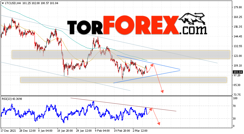 Таким образом, Litecoin прогноз курса на 11 марта 2022 предполагает попытку коррекции и тест области сопротивления вблизи уровня 109.55. Откуда стоит ожидать отскок и продолжения падения цены LTC/USD в область ниже уровня 75.05. Дополнительным сигналом в пользу снижения Litecoin выступит тест линии тренда на индикаторе относительной силы. Отменой варианта падения станет сильный рост и пробой области 130.05. Это укажет на продолжение подъёма криптовалюты с целью выше уровня 160.05.