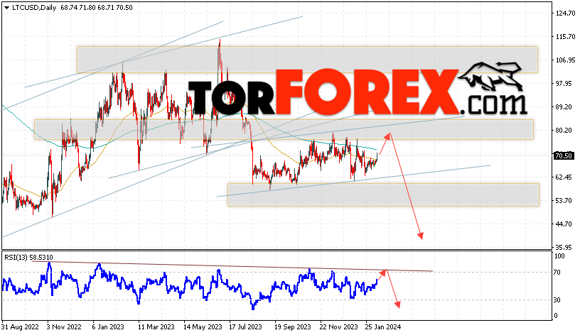 Дополнительным сигналом в пользу падения котировок LTC/USD на текущей торговой неделе 12 — 16 февраля 2024 выступит тест линии сопротивления на индикаторе относительной силы. Вторым сигналом станет отскок от верхней границы бычьего канала. Отменой варианта падения цифрового актива Litecoin станет сильный рост цены и пробой области 82.05. Это укажет на пробой поддержки и продолжение падения курса LTC/USD ниже уровня 100.55. Подтверждением падению криптовалюты выступит пробой области поддержки и закрытие котировок ниже уровня 60.05, что укажет на пробой нижней границы бычьего канала коррекции.