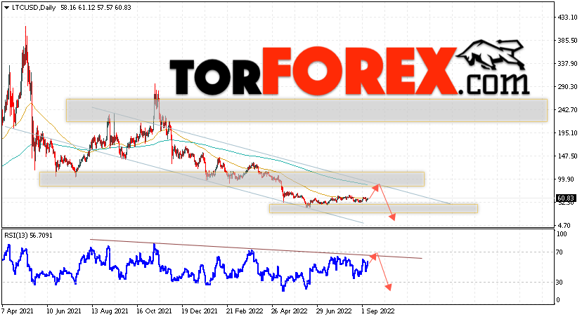Дополнительным сигналом в пользу падения котировок LTC/USD на текущей торговой неделе 12 — 16 сентября 2022 выступит тест линии тренда на индикаторе относительной силы. Вторым сигналом станет отскок от верхней границы нисходящего канала. Отменой варианта падения цифрового актива Litecoin станет сильный рост цены и пробой области 105.05. Это укажет на пробой сопротивления и продолжение роста курса LTC/USD выше уровня 175.05. Подтверждением падению криптовалюты выступит пробой области поддержки и закрытие котировок ниже уровня 50.05.