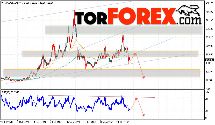 Дополнительным сигналом в пользу падения котировок LTC/USD на текущей торговой неделе 13 — 17 декабря 2021 выступит тест линии сопротивления на индикаторе относительной силы. Вторым сигналом станет отскок от нижней границы бычьего канала. Отменой варианта снижения цифрового актива Litecoin станет сильный рост цены и пробой области 245.05. Это укажет на пробой сопротивления и продолжение подъёма курса LTC/USD выше уровня 365.05. Подтверждением падению криптовалюты выступит пробой области поддержки и закрытие котировок ниже уровня 105.05.