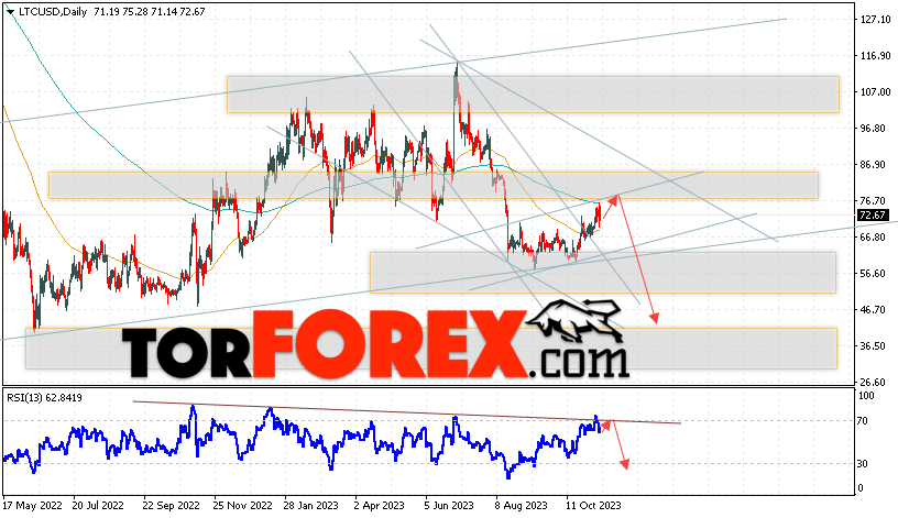 Таким образом, Litecoin прогноз курса на 13 — 17 ноября 2023 предполагает попытку теста области сопротивления вблизи уровня 77.95. Затем, продолжение падения в область ниже уровня 38.05. Дополнительным сигналом в пользу снижения Litecoin выступит тест линии тренда на индикаторе относительной силы. Отменой варианта падения станет сильный рост и пробой области 88.25. Это укажет на продолжение подъёма криптовалюты с целью выше уровня 115.65.