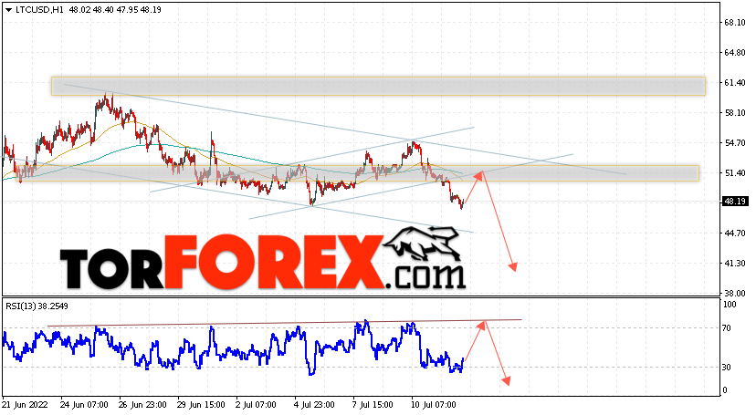 Дополнительным сигналом в пользу снижения котировок LTC/USD выступит тест линии сопротивления на индикаторе относительной силы (RSI). Вторым сигналом станет отскок от нижней границы бычьего канала. Отменой варианта падения монеты станет сильный рост стоимости актива и пробой области 57.05. Это укажет на пробой области сопротивления и продолжение роста курса криптовалюты с потенциальной целью выше уровня 65.55. С пробоем области поддержки и закрытием котировок ниже уровня 47.05 стоит ожидать подтверждения развития медвежьей тенденции по Litecoin.