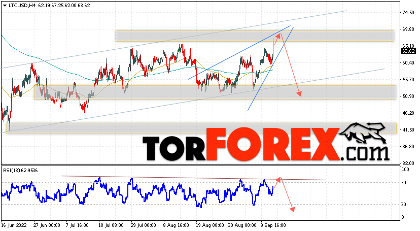 Дополнительным сигналом в пользу снижения котировок LTC/USD выступит тест линии сопротивления на индикаторе относительной силы (RSI). Вторым сигналом станет отскок от верхней границы разворотной модели ”Клин”. Отменой варианта падения монеты станет сильный рост стоимости актива и пробой области 74.55. Это укажет на пробой области сопротивления и продолжение роста курса криптовалюты с потенциальной целью выше уровня 85.05. С пробоем области поддержки и закрытием котировок ниже уровня 59.05 стоит ожидать подтверждения развития медвежьей тенденции по Litecoin, что укажет на завершение формирования разворотной модели и начало отработки паттерна с целями внизу.