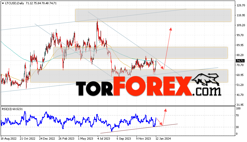 Дополнительным сигналом в пользу роста котировок LTC/USD на текущей торговой неделе 15 — 19 января 2024 выступит тест линии поддержки на индикаторе относительной силы. Вторым сигналом станет отскок от нижней границы бычьего канала. Отменой варианта роста цифрового актива Litecoin станет падение цены и пробой области 57.05. Это укажет на пробой поддержки и продолжение падения курса LTC/USD ниже уровня 50.65. Подтверждением росту криптовалюты выступит пробой области сопротивления и закрытие котировок выше уровня 81.55, что укажет на пробой верхней границы нисходящего канала.