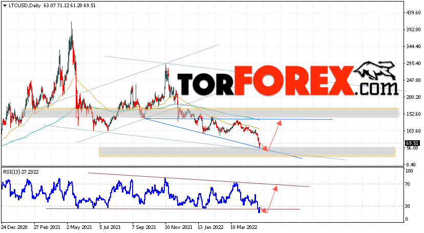 Дополнительным сигналом в пользу роста котировок LTC/USD на текущей торговой неделе 16 — 20 мая 2022 выступит тест линии тренда на индикаторе относительной силы. Вторым сигналом станет отскок от нижней границы бычьей модели ”Волна Вульфа”. Отменой варианта подъёма цифрового актива Litecoin станет падение цены и пробой области 45.00. Это укажет на пробой поддержки и продолжение падения курса LTC/USD ниже уровня 15.00. Подтверждением подъёму криптовалюты выступит пробой области сопротивления и закрытие котировок выше уровня 90.05.