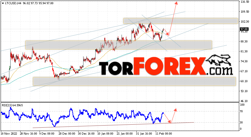 Дополнительным сигналом в пользу подъёма котировок LTC/USD выступит тест линии поддержки на индикаторе относительной силы (RSI). Вторым сигналом станет отскок от нижней границы бычьего канала. Отменой варианта роста монеты станет падение стоимости актива и пробой области 83.05. Это укажет на пробой области поддержки и продолжение падения курса криптовалюты с потенциальной целью ниже уровня 75.05. С пробоем области сопротивления и закрытием котировок выше уровня 100.55 стоит ожидать подтверждения развития бычьей тенденции по Litecoin.