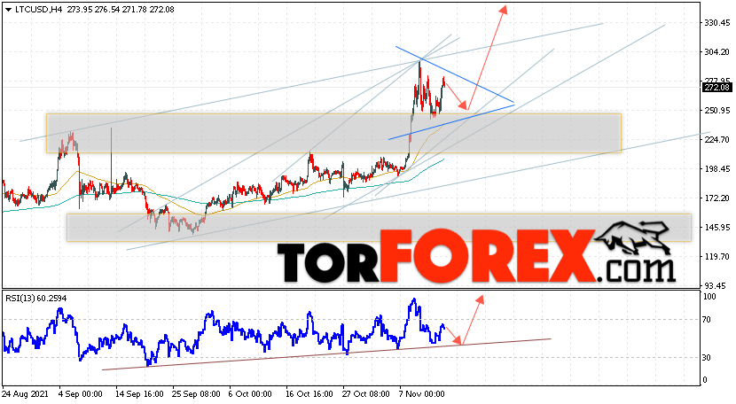 Дополнительным сигналом в пользу подъёма котировок LTC/USD выступит тест бычьей линии тренда на индикаторе относительной силы (RSI). Вторым сигналом станет отскок от нижней границы модели ”Треугольник”. Отменой варианта роста монеты станет падение стоимости актива и пробой области 205.55. Это укажет на пробой области поддержки и продолжение падения курса криптовалюты с потенциальной целью ниже уровня 175.05. С пробоем области сопротивления и закрытием котировок выше уровня 305.05 стоит ожидать подтверждения развития бычьей тенденции по Litecoin и начало отработки модели ”Треугольник”.