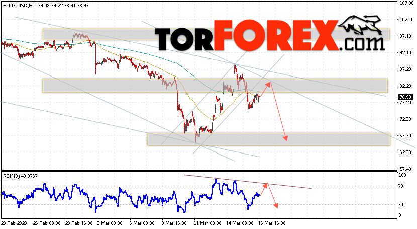 Дополнительным сигналом в пользу снижения котировок LTC/USD выступит тест линии сопротивления на индикаторе относительной силы (RSI). Вторым сигналом станет отскок от верхней границы нисходящего канала. Отменой варианта падения монеты станет сильный рост стоимости актива и пробой области 90.05. Это укажет на пробой области сопротивления и продолжение роста курса криптовалюты с потенциальной целью выше уровня 105.05. С пробоем области поддержки и закрытием котировок ниже уровня 68.05 стоит ожидать подтверждения развития нисходящего движения по криптовалюте по Litecoin.