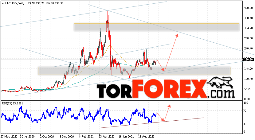 Дополнительным сигналом в пользу подъёма котировок LTC/USD на текущей торговой неделе 18 — 22 октября 2021 выступит тест линии поддержки на индикаторе относительной силы. Вторым сигналом станет отскок от нижней границы бычьего канала. Отменой варианта роста цифрового актива Litecoin станет падение цены и пробой области 95.05. Это укажет на пробой поддержки и продолжение падения курса LTC/USD ниже уровня 35.05. Подтверждением подъёма криптовалюты выступит пробой области сопротивления и закрытие котировок выше уровня 265.05.