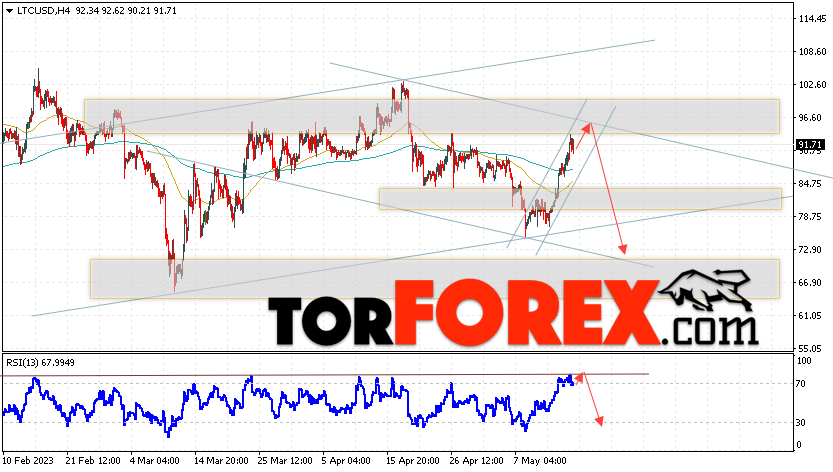 Дополнительным сигналом в пользу снижения котировок LTC/USD выступит тест линии сопротивления на индикаторе относительной силы (RSI). Вторым сигналом станет отскок от верхней границы нисходящего канала. Отменой варианта падения монеты станет сильный рост стоимости актива и пробой области 100.05. Это укажет на пробой области сопротивления и продолжение роста курса криптовалюты с потенциальной целью выше уровня 115.05. С пробоем области поддержки и закрытием котировок ниже уровня 85.65, стоит ожидать подтверждения развития медвежьего движения по криптовалюте Litecoin, что укажет на пробой нижней границы бычьего канала коррекции.