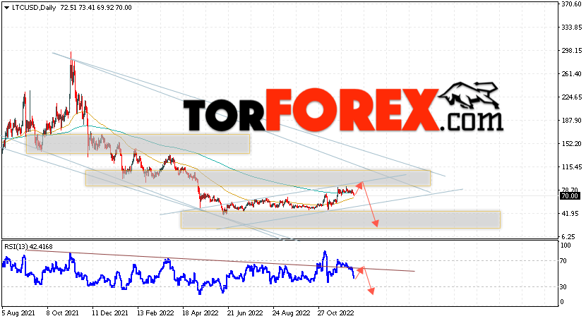 Дополнительным сигналом в пользу снижения котировок LTC/USD на текущей торговой неделе 19 — 23 декабря 2022 выступит тест линии тренда на индикаторе относительной силы. Вторым сигналом станет отскок от верхней границы бычьего канала. Отменой варианта падения цифрового актива Litecoin станет сильный рост цены и пробой области 120.05. Это укажет на пробой сопротивления и продолжение роста курса LTC/USD выше уровня 205.05. Подтверждением падению криптовалюты выступит пробой области поддержки и закрытие котировок ниже уровня 42.05, что укажет на пробой нижней границы бычьего канала коррекции.