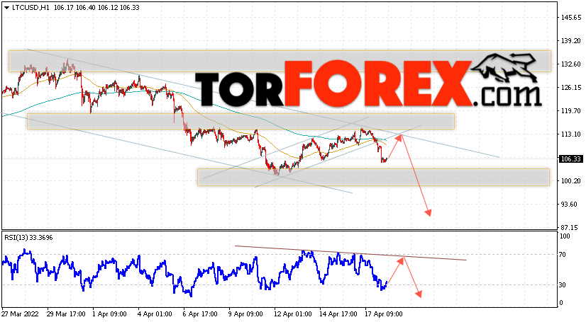 Дополнительным сигналом в пользу снижения котировок LTC/USD выступит тест линии сопротивления на индикаторе относительной силы (RSI). Вторым сигналом станет отскок от верхней границы медвежьего канала. Отменой варианта падения монеты станет сильный рост стоимости актива и пробой области 118.05. Это укажет на пробой области сопротивления и продолжение роста курса криптовалюты с потенциальной целью выше уровня 125.05. С пробоем области поддержки и закрытием котировок ниже уровня 100.55 стоит ожидать подтверждения развития медвежьей тенденции по Litecoin.