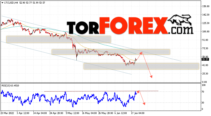 Дополнительным сигналом в пользу снижения котировок LTC/USD выступит тест линии сопротивления на индикаторе относительной силы (RSI). Вторым сигналом станет отскок от верхней границы нисходящего канала. Отменой варианта падения монеты станет сильный рост стоимости актива и пробой области 76.55. Это укажет на пробой области сопротивления и продолжение роста курса криптовалюты с потенциальной целью выше уровня 95.05. С пробоем области поддержки и закрытием котировок ниже уровня 38.05 стоит ожидать подтверждения развития медвежьей тенденции по Litecoin.