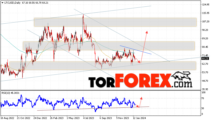 Дополнительным сигналом в пользу роста котировок LTC/USD на текущей торговой неделе 22 — 26 января 2024 выступит тест линии поддержки на индикаторе относительной силы. Вторым сигналом станет отскок от нижней границы бычьего канала. Отменой варианта роста цифрового актива Litecoin станет падение цены и пробой области 54.05. Это укажет на пробой поддержки и продолжение падения курса LTC/USD ниже уровня 48.05. Подтверждением росту криптовалюты выступит пробой области сопротивления и закрытие котировок выше уровня 81.55, что укажет на пробой верхней границы нисходящего канала и начала отработки разворотного паттерна с целями вверху.