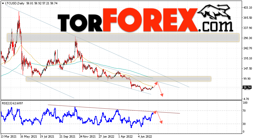 Дополнительным сигналом в пользу падения котировок LTC/USD на текущей торговой неделе 25 — 29 июля 2022 выступит тест линии тренда на индикаторе относительной силы. Вторым сигналом станет отскок от верхней границы нисходящего канала. Отменой варианта падения цифрового актива Litecoin станет сильный рост цены и пробой области 105.05. Это укажет на пробой сопротивления и продолжение роста курса LTC/USD выше уровня 185.05. Подтверждением падению криптовалюты выступит пробой области поддержки и закрытие котировок ниже уровня 40.05.