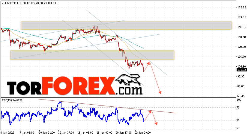 Таким образом, Litecoin прогноз курса на 25 января 2022 предполагает попытку коррекции и тест области сопротивления вблизи уровня 107.55. Откуда стоит ожидать отскок и продолжения падения цены LTC/USD в область ниже уровня 70.05. Дополнительным сигналом в пользу снижения Litecoin выступит тест линии тренда на индикаторе относительной силы. Отменой варианта падения станет сильный рост и пробой области 125.05. Это укажет на продолжение подъёма криптовалюты с целью выше уровня 175.55.
