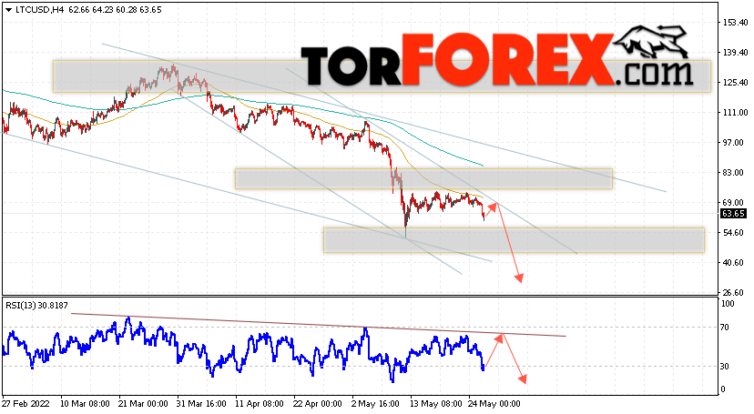 Дополнительным сигналом в пользу снижения котировок LTC/USD выступит тест линии сопротивления на индикаторе относительной силы (RSI). Вторым сигналом станет отскок от верхней границы нисходящего канала. Отменой варианта падения монеты станет сильный рост стоимости актива и пробой области 85.05. Это укажет на пробой области сопротивления и продолжение роста курса криптовалюты с потенциальной целью выше уровня 100.05. С пробоем области поддержки и закрытием котировок ниже уровня 55.05 стоит ожидать подтверждения развития медвежьей тенденции по Litecoin.