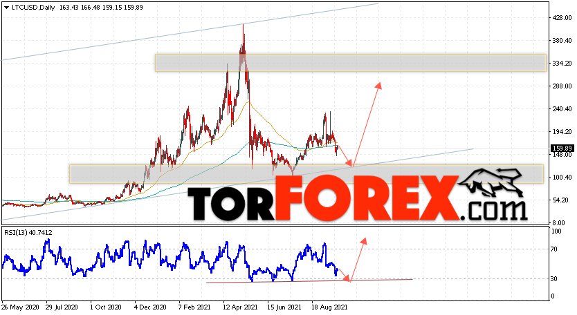 Дополнительным сигналом в пользу подъёма котировок LTC/USD на текущей торговой неделе 27 сентября — 1 октября 2021 выступит тест линии поддержки на индикаторе относительной силы. Вторым сигналом станет отскок от нижней границы бычьего канала. Отменой варианта роста цифрового актива Litecoin станет падение цены и пробой области 95.05. Это укажет на пробой поддержки и продолжение падения курса LTC/USD ниже уровня 45.05. Подтверждением подъёма криптовалюты выступит пробой области сопротивления и закрытие котировок выше уровня 245.05.
