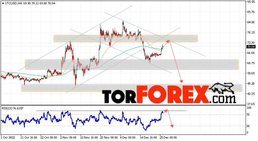 Дополнительным сигналом в пользу снижения котировок LTC/USD выступит тест линии сопротивления на индикаторе относительной силы (RSI). Вторым сигналом станет отскок от верхней границы нисходящего канала. Отменой варианта падения монеты станет сильный рост стоимости актива и пробой области 79.75. Это укажет на пробой области сопротивления и продолжение роста курса криптовалюты с потенциальной целью выше уровня 87.55. С пробоем области поддержки и закрытием котировок ниже уровня 61.05 стоит ожидать подтверждения развития нисходящей тенденции по Litecoin.