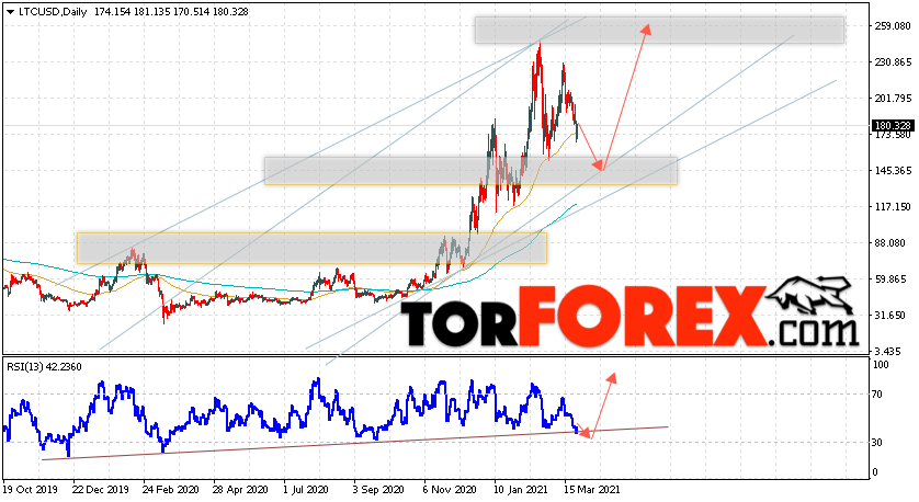 Дополнительным сигналом в пользу подъёма котировок LTC/USD на текущей торговой неделе 29 марта — 2 апреля 2021 выступит тест линии тренда на индикаторе относительной силы. Вторым сигналом станет отскок от нижней границы восходящего канала. Отменой варианта роста цифрового актива Litecoin станет падение цен и пробой области 105.05. Это укажет на пробой области поддержки и продолжение падения курса LTC/USD ниже уровня 65.05. Подтверждением подъёма криптовалюты выступит пробой области сопротивления и закрытие котировок выше уровня 235.05.