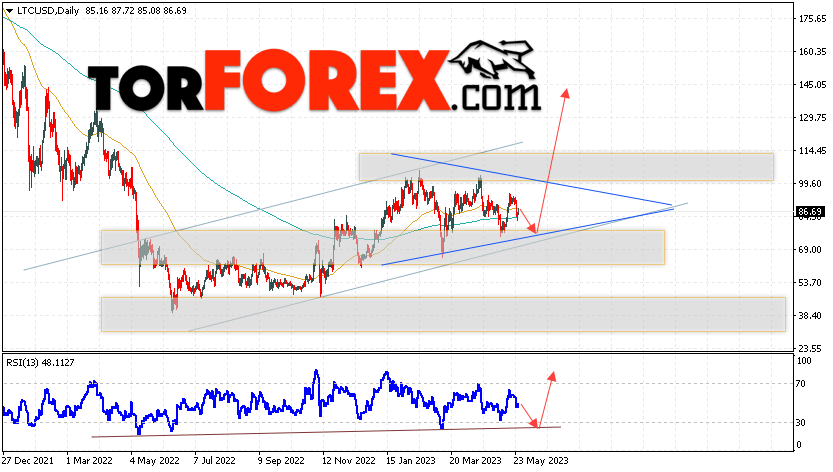 Дополнительным сигналом в пользу роста котировок LTC/USD на текущей торговой неделе 29 мая — 2 июня 2023 выступит тест линии тренда на индикаторе относительной силы. Вторым сигналом станет отскок от нижней границы модели «Треугольник». Отменой варианта подъёма цифрового актива Litecoin станет падение цены и пробой области 64.05. Это укажет на пробой поддержки и продолжение падения курса LTC/USD ниже уровня 45.05. Подтверждением росту криптовалюты выступит пробой области сопротивления и закрытие котировок выше уровня 105.05, что укажет на пробой верхней границы модели «Треугольник» и начало отработки модели с целями вверху.