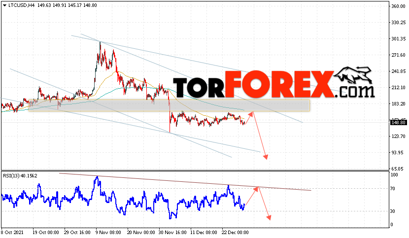 Дополнительным сигналом в пользу снижения котировок LTC/USD выступит тест линии сопротивления на индикаторе относительной силы (RSI). Вторым сигналом станет отскок от верхней границы нисходящего канала. Отменой варианта падения монеты сильный рост стоимости актива и пробой области 190.55. Это укажет на пробой области сопротивления и продолжение роста курса криптовалюты с потенциальной целью выше уровня 230.55. С пробоем области поддержки и закрытием котировок ниже уровня 135.05 стоит ожидать подтверждения развития медвежьей тенденции по Litecoin, что укажет на пробой нижней границы боковика, который мы наблюдаем с начала месяца.