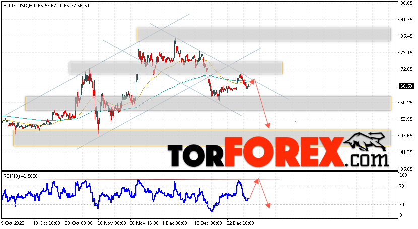 Дополнительным сигналом в пользу снижения котировок LTC/USD выступит тест линии сопротивления на индикаторе относительной силы (RSI). Вторым сигналом станет отскок от верхней границы нисходящего канала. Отменой варианта падения монеты станет сильный рост стоимости актива и пробой области 76.65. Это укажет на пробой области сопротивления и продолжение роста курса криптовалюты с потенциальной целью выше уровня 87.05. С пробоем области поддержки и закрытием котировок ниже уровня 60.05 стоит ожидать подтверждения развития нисходящей тенденции по Litecoin.