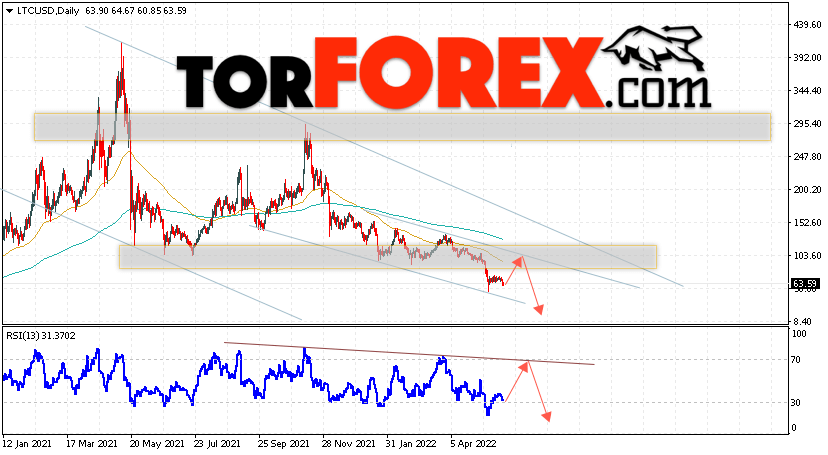 Дополнительным сигналом в пользу падения котировок LTC/USD на текущей торговой неделе 30 мая — 3 июня 2022 выступит тест линии тренда на индикаторе относительной силы. Вторым сигналом станет отскок от верхней границы нисходящего канала. Отменой варианта падения цифрового актива Litecoin станет сильный рост цены и пробой области 115.55. Это укажет на пробой сопротивления и продолжение роста курса LTC/USD выше уровня 175.05. Подтверждением падению криптовалюты выступит пробой области поддержки и закрытие котировок ниже уровня 50.55.