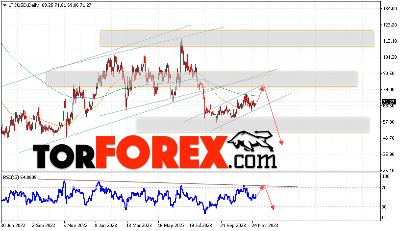 Дополнительным сигналом в пользу падения котировок LTC/USD на текущей торговой неделе 4 — 8 декабря 2023 выступит тест линии сопротивления на индикаторе относительной силы. Вторым сигналом станет отскок от верхней границы бычьего канала. Отменой варианта падения цифрового актива Litecoin станет сильный рост цены и пробой области 89.55. Это укажет на пробой сопротивления и продолжение роста курса LTC/USD выше уровня 115.05. Подтверждением падению криптовалюты выступит пробой области поддержки и закрытие котировок ниже уровня 60.95, что укажет на пробой нижней границы бычьего канала коррекции.