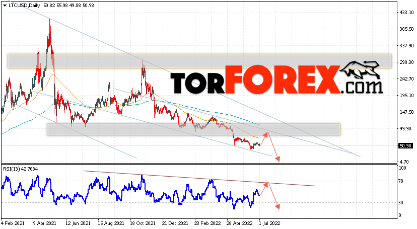 Дополнительным сигналом в пользу падения котировок LTC/USD на текущей торговой неделе 4 — 8 июля 2022 выступит тест линии тренда на индикаторе относительной силы. Вторым сигналом станет отскок от верхней границы нисходящего канала. Отменой варианта падения цифрового актива Litecoin станет сильный рост цены и пробой области 105.05. Это укажет на пробой сопротивления и продолжение роста курса LTC/USD выше уровня 175.05. Подтверждением падению криптовалюты выступит пробой области поддержки и закрытие котировок ниже уровня 40.05.
