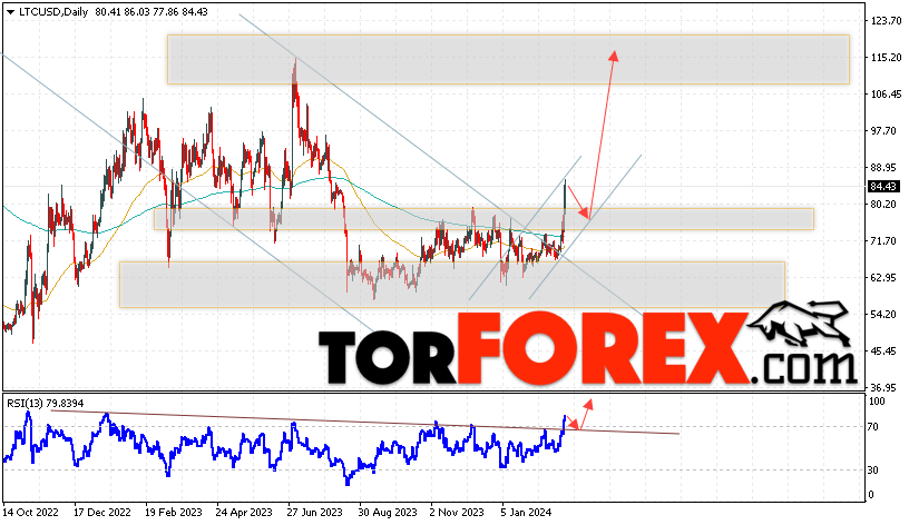 Дополнительным сигналом в пользу роста котировок LTC/USD на текущей торговой неделе 4 — 8 марта 2024 выступит тест линии поддержки на индикаторе относительной силы. Вторым сигналом станет отскок от нижней границы бычьего канала. Отменой варианта роста цифрового актива Litecoin станет падение цены и пробой области 69.05. Это укажет на пробой поддержки и продолжение падения курса LTC/USD ниже уровня 55.05. Подтверждением росту криптовалюты выступит пробой области сопротивления и закрытие котировок выше уровня 92.55.