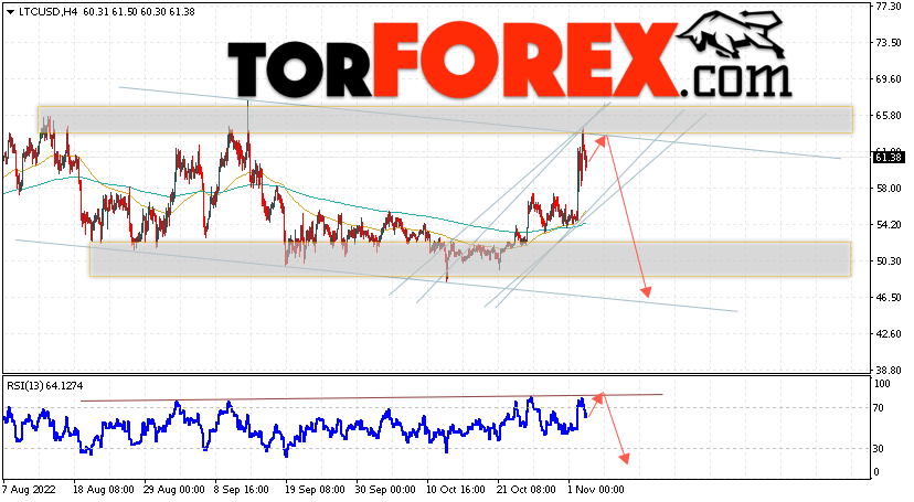 Дополнительным сигналом в пользу снижения котировок LTC/USD выступит тест линии сопротивления на индикаторе относительной силы (RSI). Вторым сигналом станет отскок от верхней границы нисходящего канала. Отменой варианта падения монеты станет сильный рост стоимости актива и пробой области 67.65. Это укажет на пробой области сопротивления и продолжение роста курса криптовалюты с потенциальной целью выше уровня 75.65. С пробоем области поддержки и закрытием котировок ниже уровня 53.45 стоит ожидать подтверждения развития медвежьей тенденции по Litecoin, что укажет на пробой нижней границы бычьего канала коррекции.