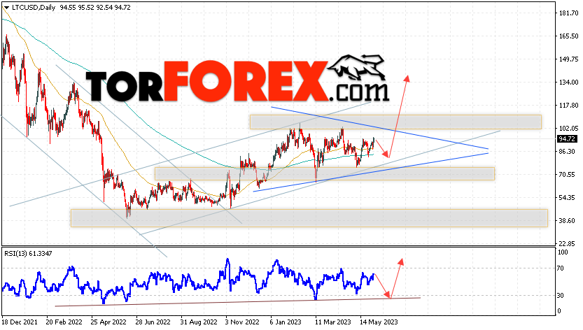 Дополнительным сигналом в пользу роста котировок LTC/USD на текущей торговой неделе 5 — 9 июня 2023 выступит тест линии тренда на индикаторе относительной силы. Вторым сигналом станет отскок от нижней границы модели «Треугольник». Отменой варианта подъёма цифрового актива Litecoin станет падение цены и пробой области 66.55. Это укажет на пробой поддержки и продолжение падения курса LTC/USD ниже уровня 50.65. Подтверждением росту криптовалюты выступит пробой области сопротивления и закрытие котировок выше уровня 105.05, что укажет на пробой верхней границы модели «Треугольник» и начало отработки модели с целями вверху.
