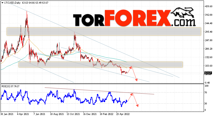 Дополнительным сигналом в пользу падения котировок LTC/USD на текущей торговой неделе 6 — 10 июня 2022 выступит тест линии тренда на индикаторе относительной силы. Вторым сигналом станет отскок от верхней границы нисходящего канала. Отменой варианта падения цифрового актива Litecoin станет сильный рост цены и пробой области 115.55. Это укажет на пробой сопротивления и продолжение роста курса LTC/USD выше уровня 195.05. Подтверждением падению криптовалюты выступит пробой области поддержки и закрытие котировок ниже уровня 50.55.