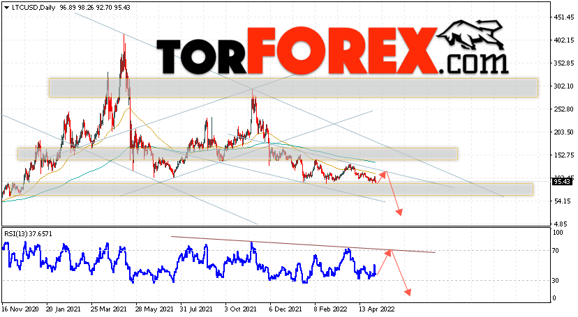 Дополнительным сигналом в пользу падения котировок LTC/USD на текущей торговой неделе 9 — 13 мая 2022 выступит тест линии тренда на индикаторе относительной силы. Вторым сигналом станет отскок от верхней границы нисходящего канала. Отменой варианта снижения цифрового актива Litecoin станет сильный рост цены и пробой области 145.05. Это укажет на пробой сопротивления и продолжение подъёма курса LTC/USD выше уровня 285.05. Подтверждением падению криптовалюты выступит пробой области поддержки и закрытие котировок ниже уровня 85.05.