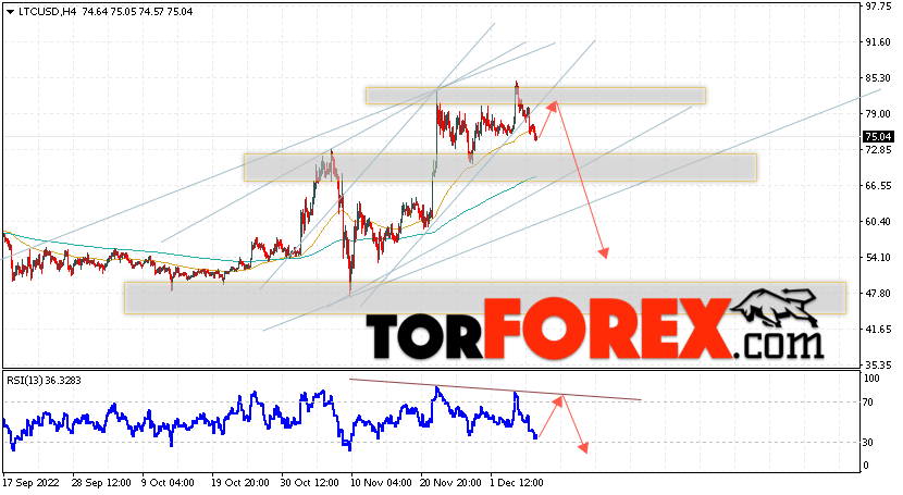 Дополнительным сигналом в пользу падения котировок LTC/USD выступит тест линии сопротивления на индикаторе относительной силы (RSI). Вторым сигналом станет отскок от нижней границы бычьего канала, который был пробит вниз продавцами актива. Отменой варианта падения монеты станет сильный рост стоимости актива и пробой области 88.65. Это укажет на пробой области сопротивления и продолжение роста курса криптовалюты с потенциальной целью выше уровня 110.55. С пробоем области поддержки и закрытием котировок ниже уровня 64.05 стоит ожидать подтверждения развития нисходящей тенденции по Litecoin.