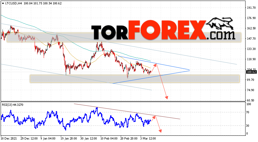 Дополнительным сигналом в пользу падения котировок LTC/USD выступит тест линии сопротивления на индикаторе относительной силы (RSI). Вторым сигналом станет отскок от верхней границы модели ”Треугольник”. Отменой варианта падения монеты сильный рост стоимости актива и пробой области 135.05. Это укажет на пробой области сопротивления и продолжение подъёма курса криптовалюты с потенциальной целью выше уровня 165.05. С пробоем области поддержки и закрытием котировок ниже уровня 85.55 стоит ожидать подтверждения развития медвежьей тенденции по Litecoin и начало отработки модели ”Треугольник”.