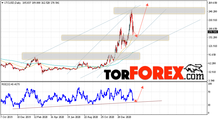 Дополнительным сигналом в пользу подъёма котировок LTC/USD на текущей торговой неделе 1 — 5 марта 2021 выступит тест линии тренда на индикаторе относительной силы. Вторым сигналом станет отскок от нижней границы восходящего канала. Отменой варианта роста цифрового актива Litecoin станет падение цен и пробой области 115.05. Это укажет на пробой области поддержки и продолжение падения курса LTC/USD ниже уровня 85.05. Подтверждением подъёма криптовалюты выступит пробой области сопротивления и закрытие котировок выше уровня 205.05.