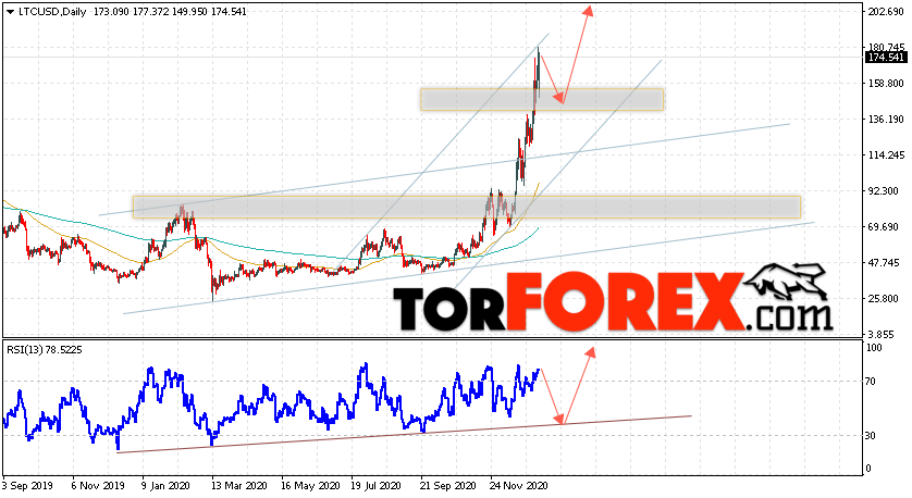 Дополнительным сигналом в пользу подъёма котировок LTC/USD на текущей торговой неделе неделю 11 — 15 января 2021 выступит тест линии тренда на индикаторе относительной силы. Вторым сигналом станет отскок от нижней границы восходящего канала. Отменой варианта роста цифрового актива Litecoin станет падение цен и пробой области 105.05. Это укажет на пробой области поддержки и продолжение падения курса LTC/USD ниже уровня 65.05. Подтверждением подъёма криптовалюты выступит пробой области сопротивления и закрытие котировок выше уровня 195.05.