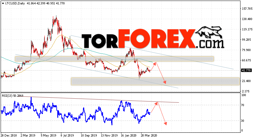 Дополнительным сигналом в пользу снижения котировок LTC/USD на текущей торговой неделе 20 — 24 апреля 2020 выступит тест линии сопротивления на индикаторе относительной силы. Вторым сигналом станет отскок от верхней границы нисходящего канала. Отменой варианта падения цифрового актива Litecoin станет сильный рост цен и пробой области 75.00. Это укажет на пробой верхней границы нисходящего канала и продолжение подъёма курса LTC/USD выше уровня 125.05. Подтверждением снижения криптовалюты выступит пробой области поддержки и закрытие котировок ниже уровня 35.05.